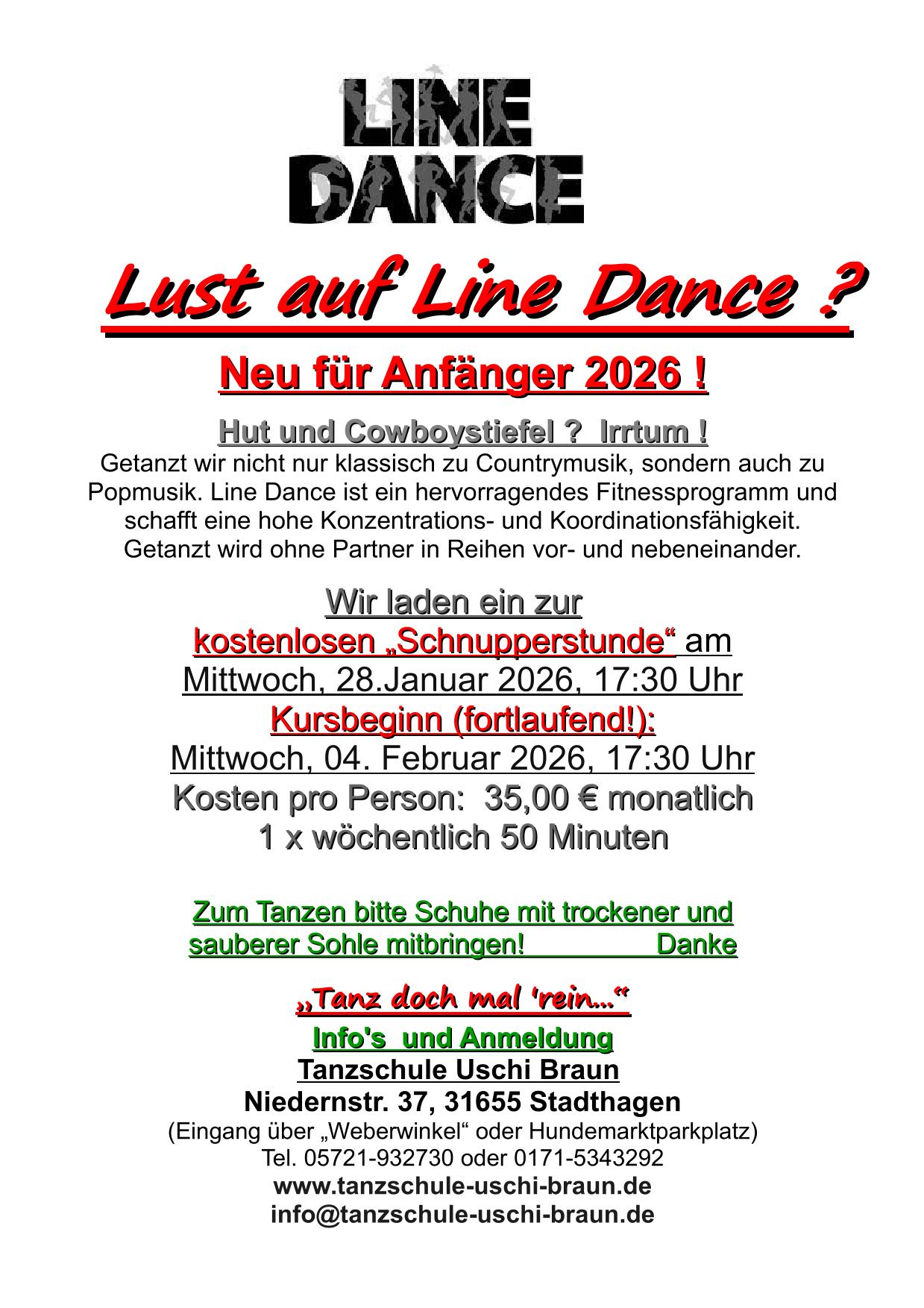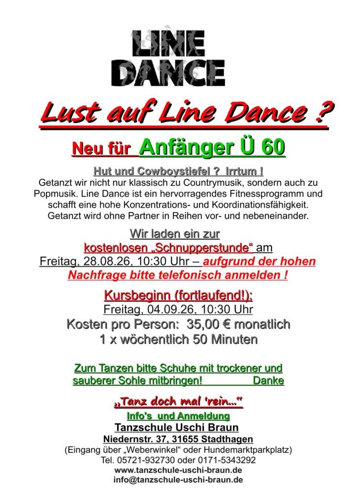 Tanzen ist eine tolle Möglichkeit, sich zu bewegen und Spaß zu haben. Es ermöglicht es Ihnen, Musik durch Bewegungen auszudrücken, Kreativität auszudrücken und ein Gefühl von Freiheit und Ausdruck zu erleben. Tanzen kann helfen, Stress abzubauen, die Konzentration zu verbessern und die mentale Gesundheit zu stärken. Es gibt verschiedene Arten von Tanzstilen, angefangen beim Line Dance, TOP60(tanzen ohne Partner) bis hin zu Lateinamerikanischen Tänzen. Tanzen ist auch eine tolle Möglichkeit, neue Leute kennenzulernen und die Gemeinschaft zu stärken. Egal, ob Sie tanzen, um fit zu bleiben oder um Ihre kreativen Seiten auszudrücken. Tanzen bietet für jeden etwas.